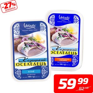 Оселедець «Козацький», філе-шматочки в олії або з італійськими спеціями, ТМ «Veladis», 180 г