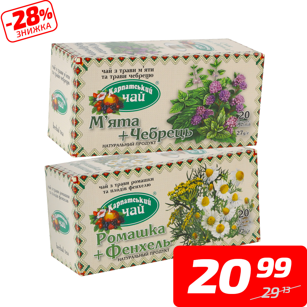 Чай «М’ята+Чебрець» або «Ромашка+Фенхель», ТМ «Карпатський чай», 20*1,35 г