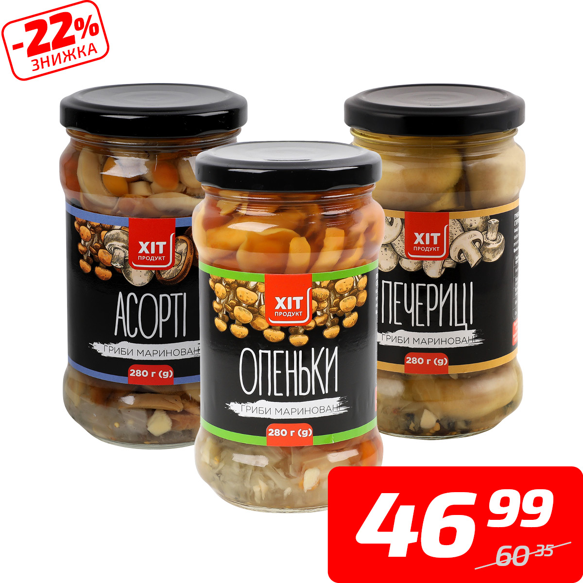 Гриби «Опеньки», «Асорті» або «Печериці» мариновані, ТМ «Хіт Продукт», 280 г