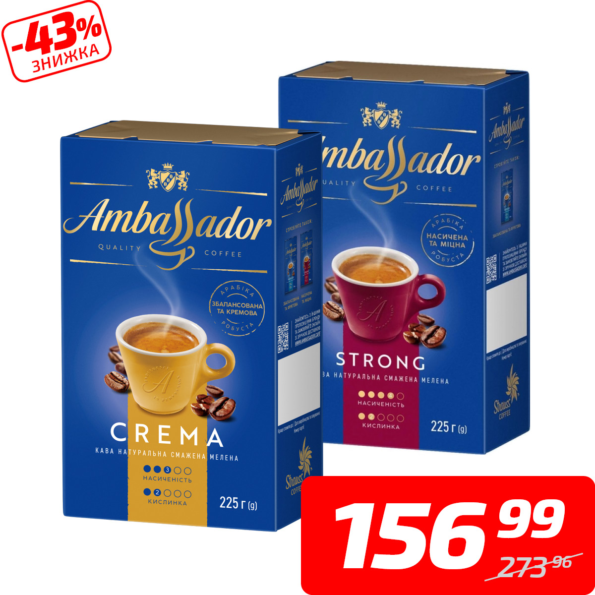 Кава «Стронг» або «Крема», мелена, ТМ «Амбассадор», 225 г