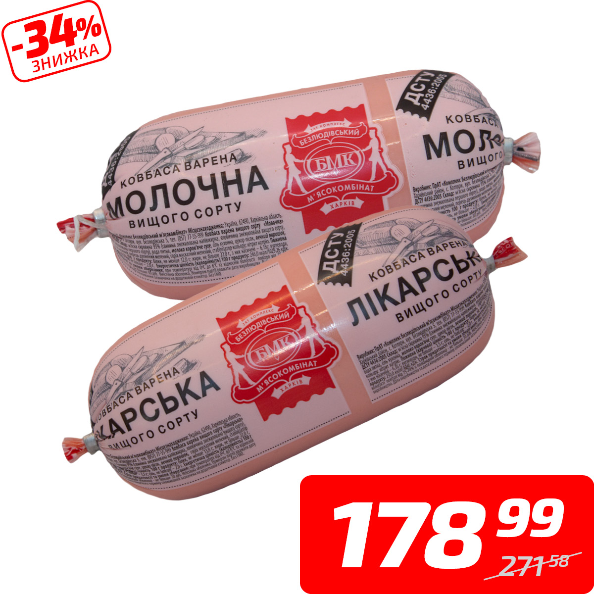Ковбаса «Лікарська» або «Молочна», варена, в/г, ТМ «Безлюдівський МК», 1 кг