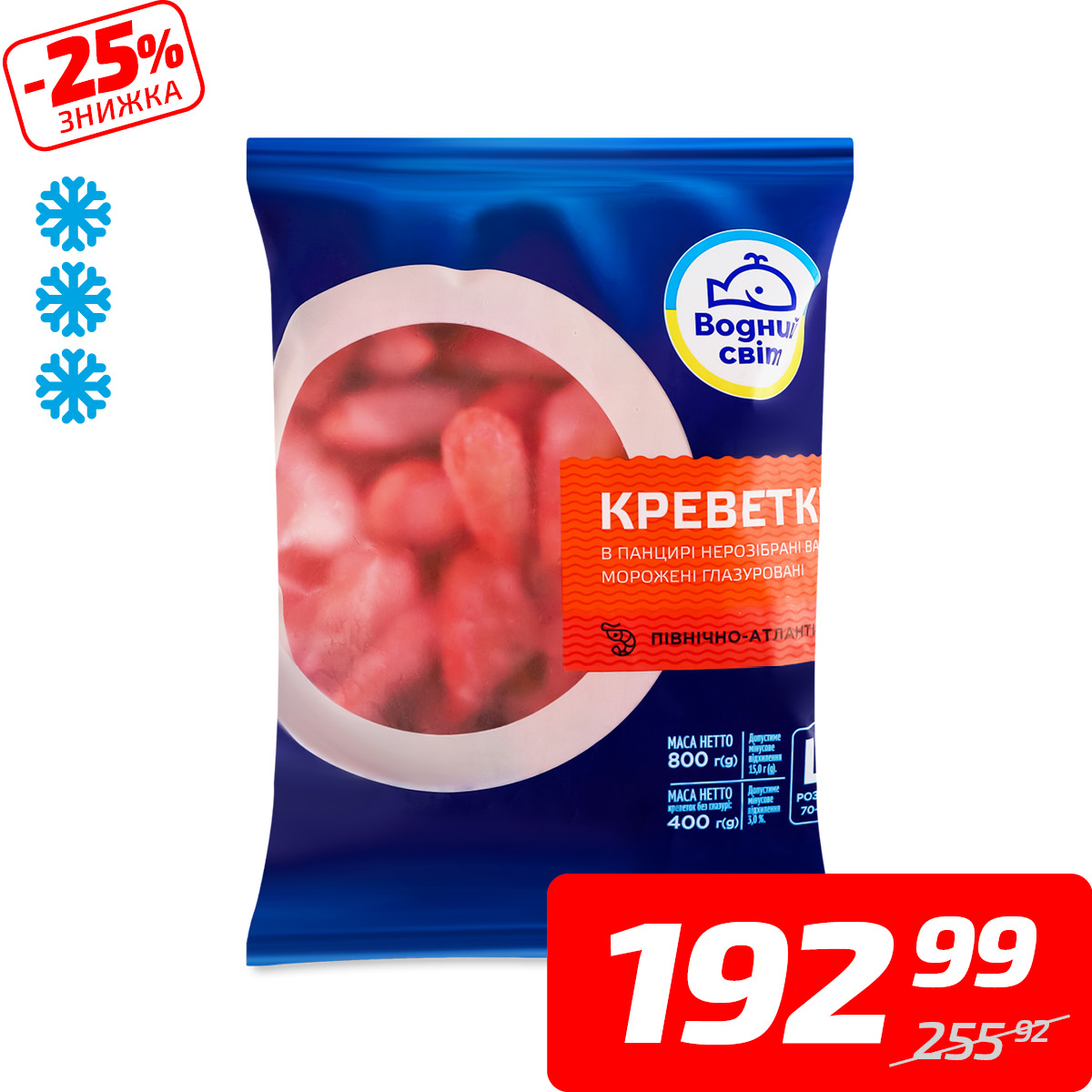 Креветки північно-атлантичні, 70/90, в/м, ТМ «Водний світ», 800 г