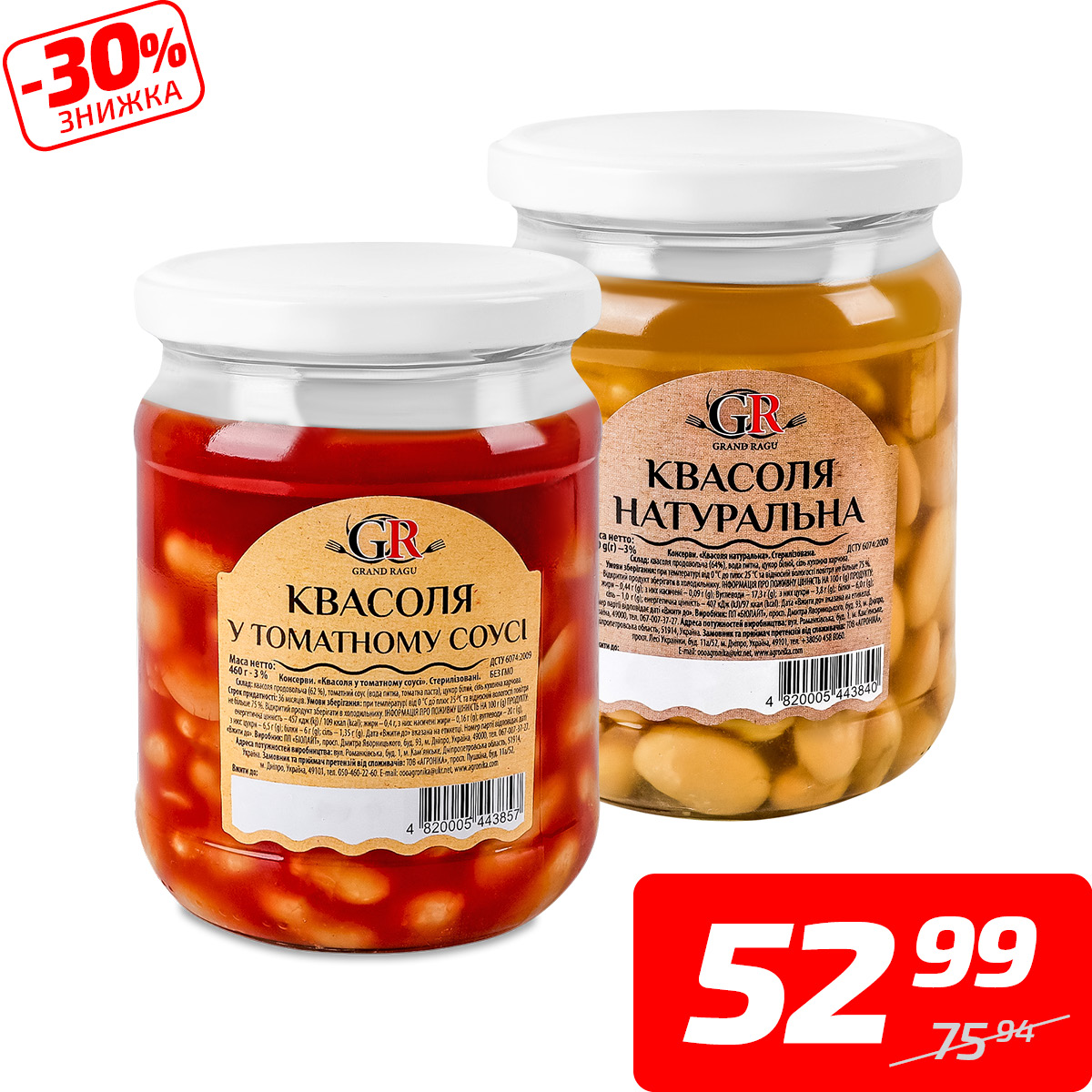 Квасоля натуральна або у томатному соусі, ТМ «Гранд Рагу», 460 г