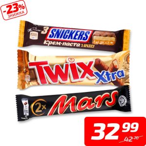 Батончик в асортименті, ТМ «Марс», «Твікс» або «Снікерс», 54,75-75 г
