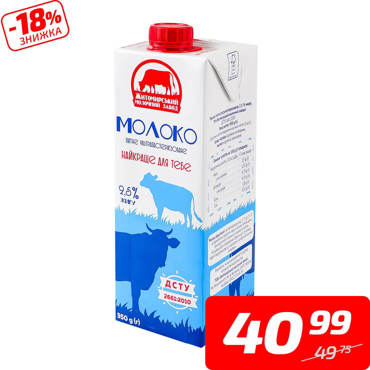 Молоко ультрапастеризоване, 2,5%, ТМ «Житомирський молочний завод», 950 г