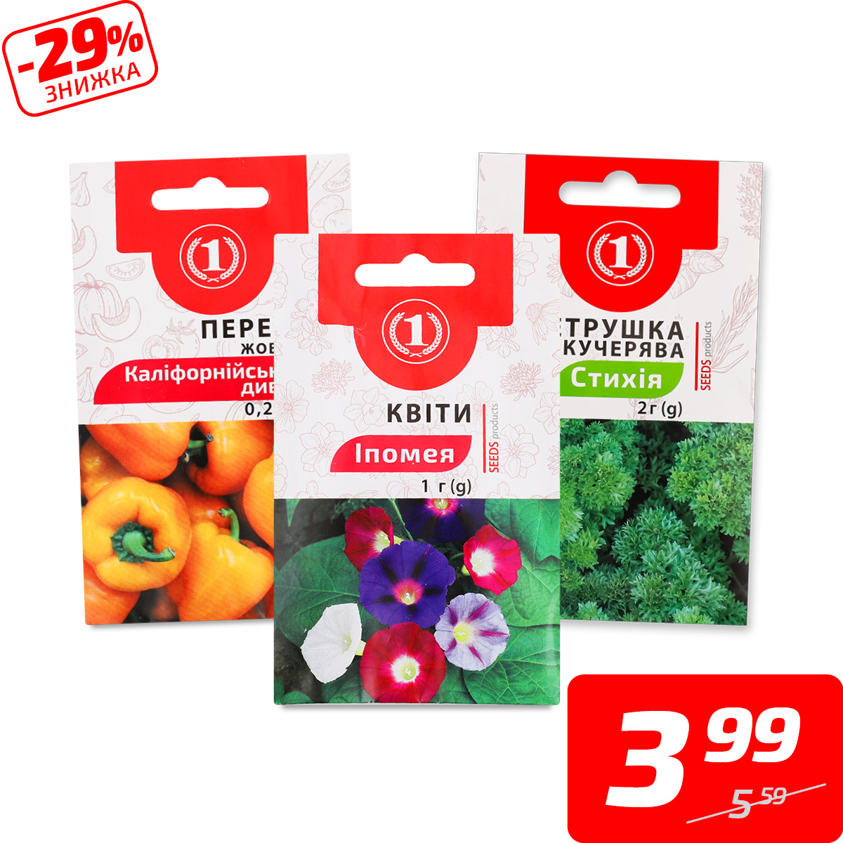 Насіння овочів, зелені та квітів в асортименті, ТМ «1», 0,1-3 г