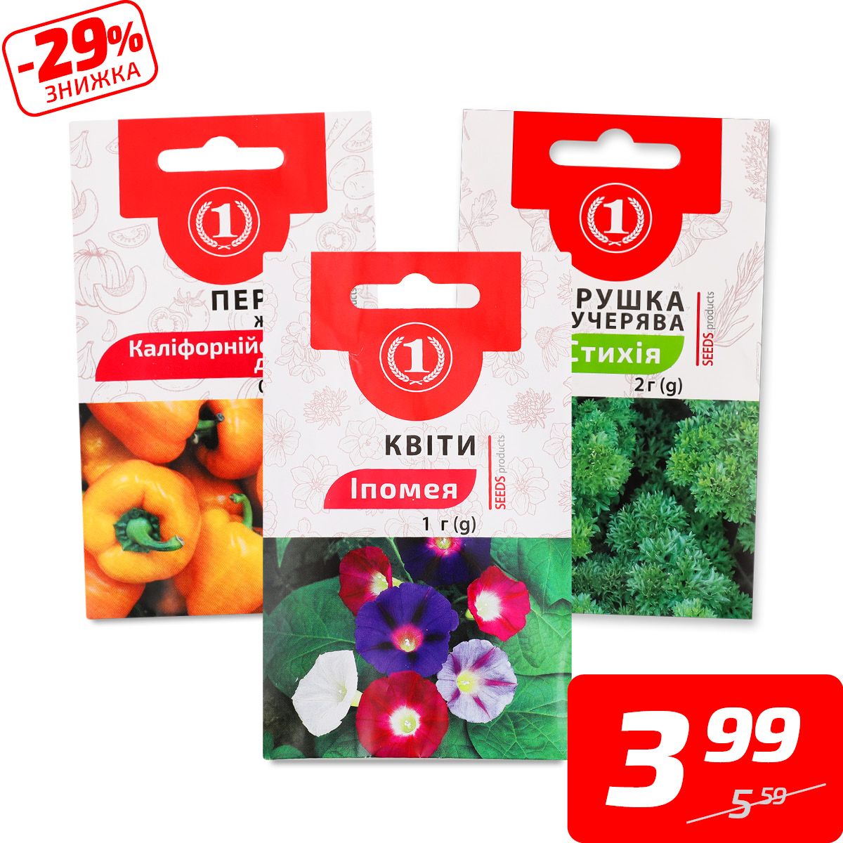 Насіння овочів, зелені та квітів в асортименті, ТМ «1», 0,1-3 г