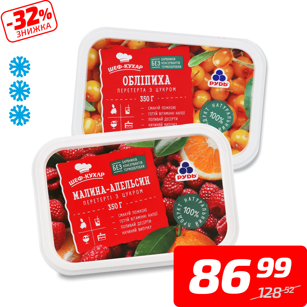 Обліпиха, малина-апельсин або журавлина-лимон перетерта з цукром, ТМ «Рудь», 350 г