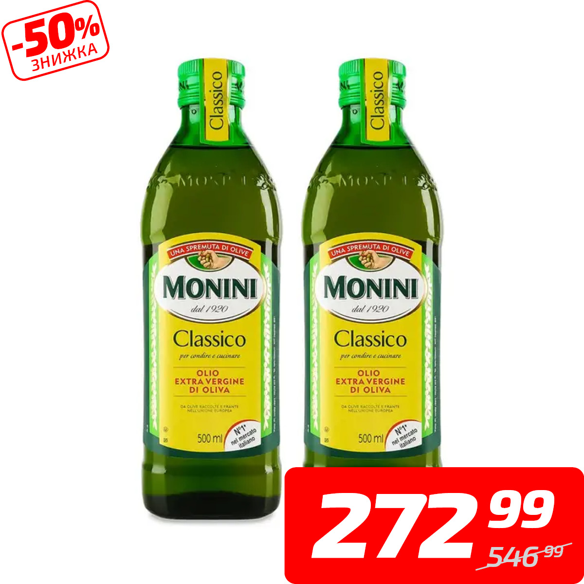 Олія оливкова «Класіко Екстра вірджін», скло, ТМ «Моніні», 500 мл