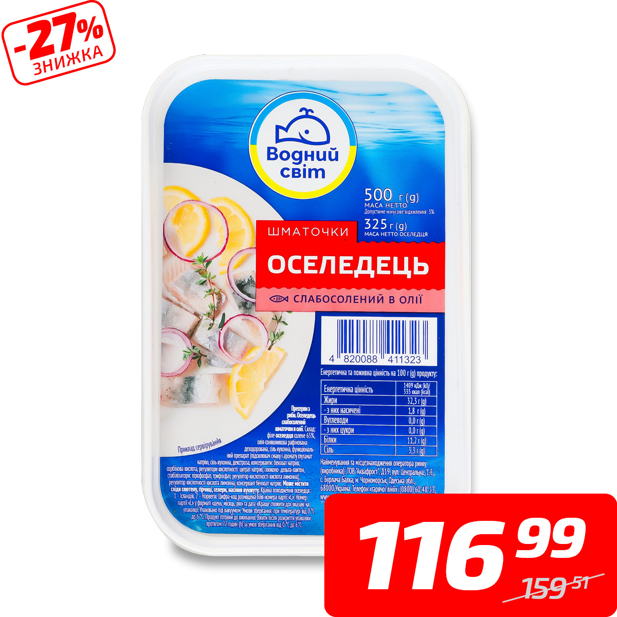 Оселедець, слабосолений в олії, шматочки, ТМ «Водний світ», 500 г
