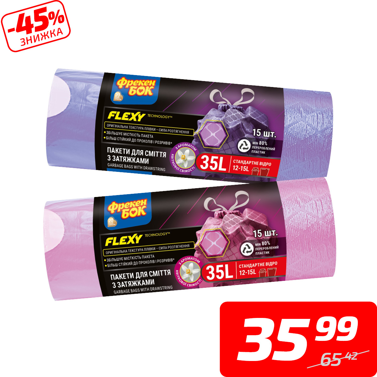 Пакети для смiття «Flexy» із затяжками, 35 л, ТМ «Фрекен Бок», 15 шт.