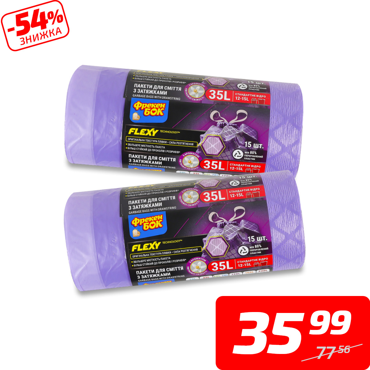 Пакети для смiття «Flexy» з затяжками, 35 л, ТМ «Фрекен Бок», 15 шт.