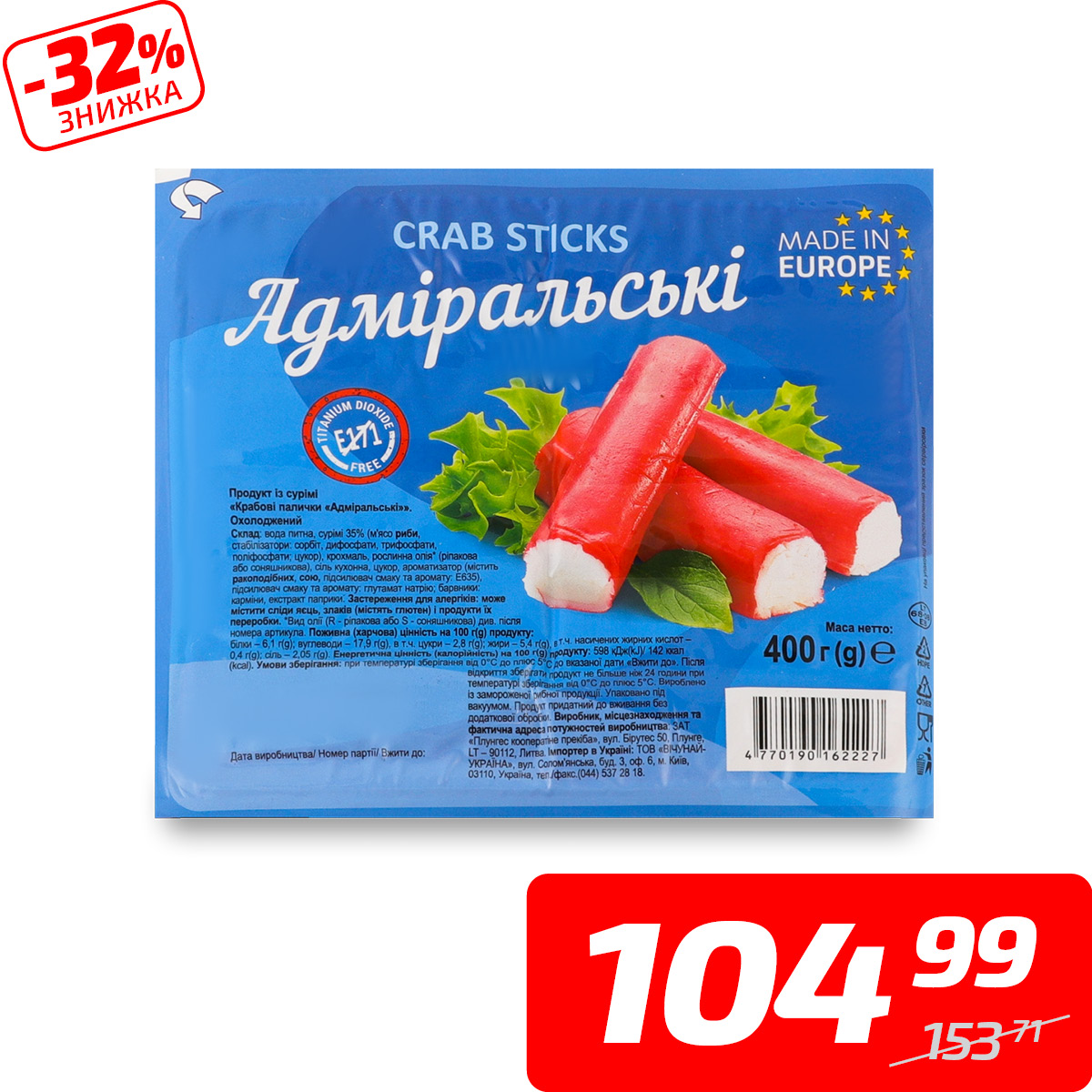 Палички крабові «Адміральські», охолоджені, ТМ «Плунгес», 400 г
