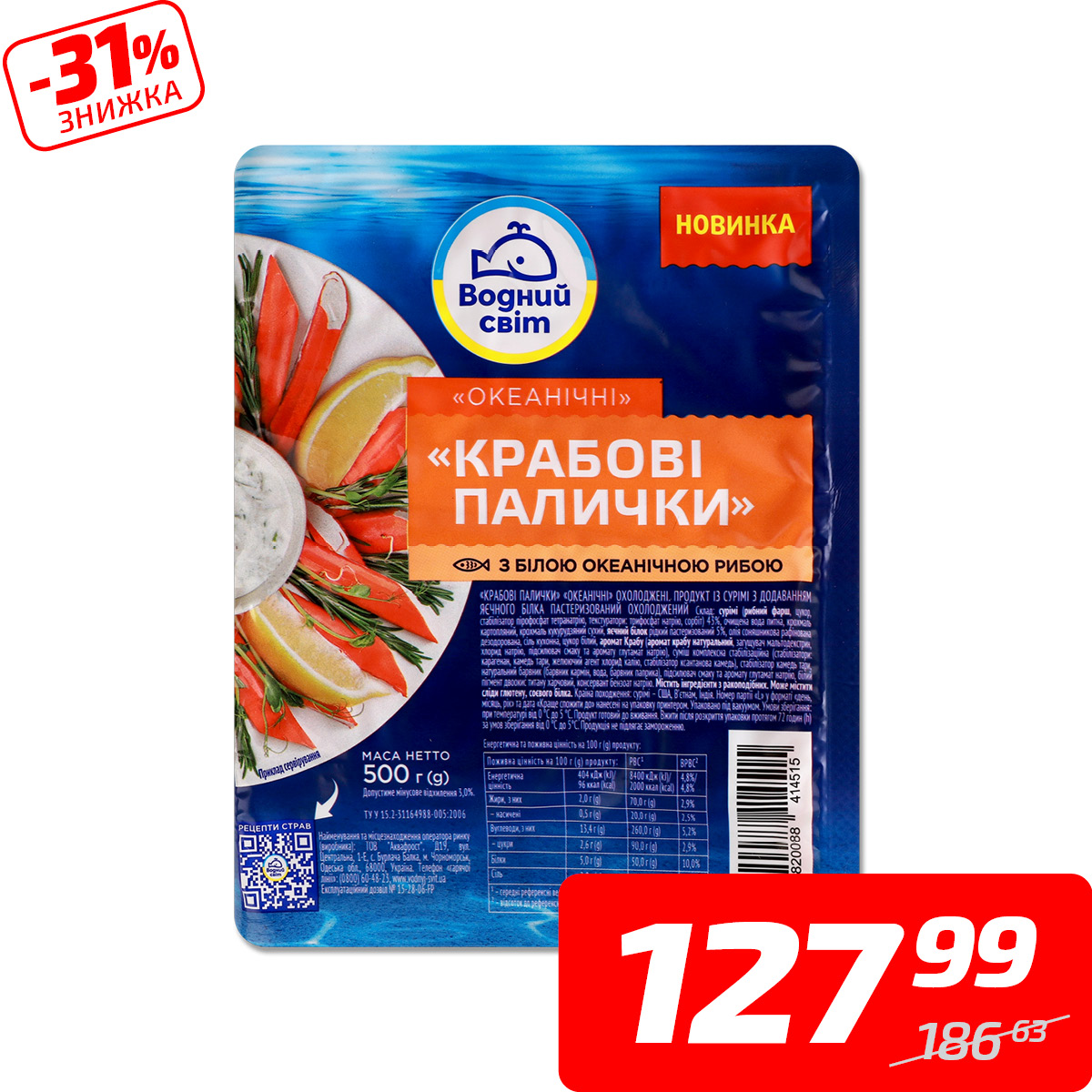 Палички крабові «Океанічні», охолоджені, ТМ «Водний світ», 500 г