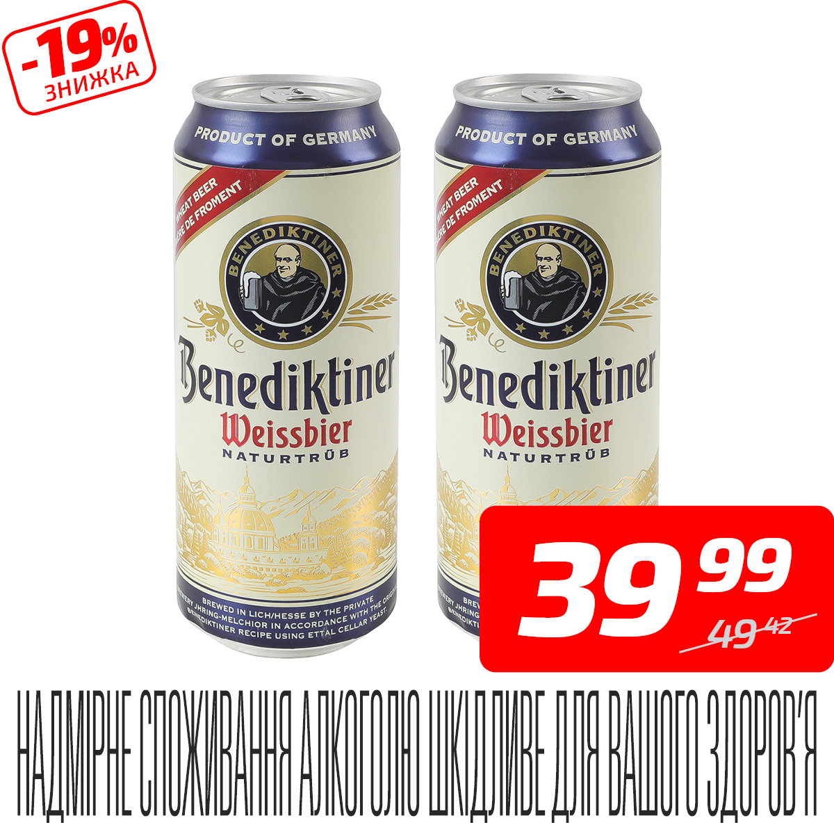 Пиво «Weissbier» світле нефільтроване, 5,4%, ж/б, ТМ «Benediktiner», 0,5 л