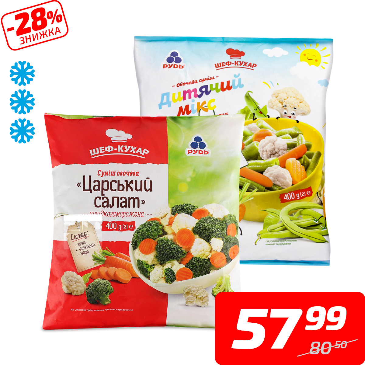 Салат царський або суміш овочева «Дитячий мікс» або «Весняна», с/м, ТМ «Рудь», 400 г