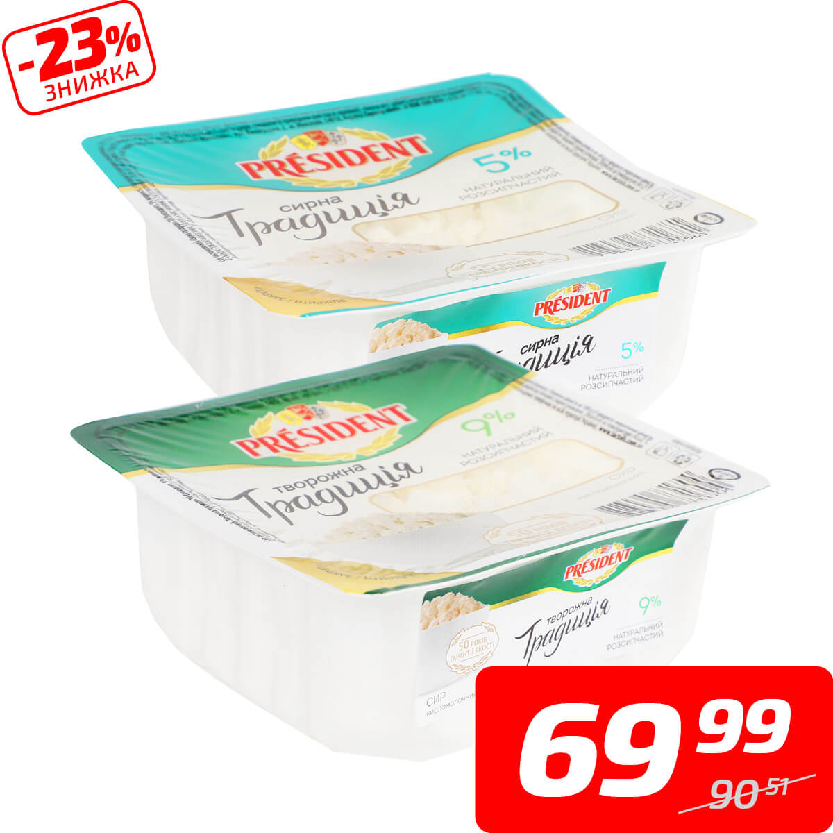 Сир кисломолочний «Сирна традиція», 5% або 9%, ТМ «Президент», 300 г