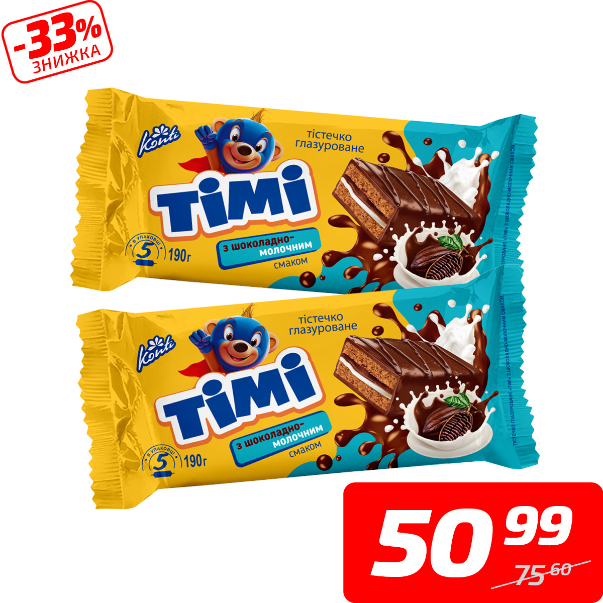 Тістечко «Тімі» з шоколадно-молочним смаком, глазуроване, ТМ «Конті», 5*38 г